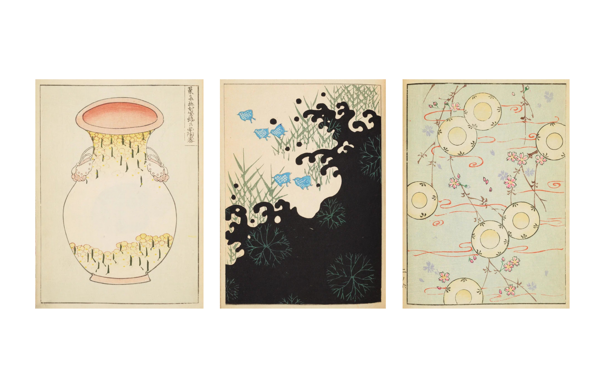 Its pages are filled with graphic studies of flora, landscapes and everyday objects, rendered with a clarity and control that would later influence both Japanese and Western design movements. Ornament and discipline sit in balance, with repeating motifs that feel considered rather than decorative and excessive.
